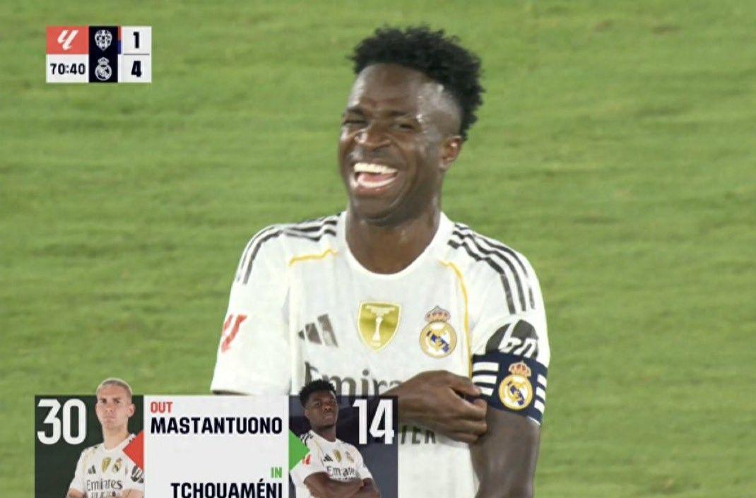 一场进球、一次助攻、一次亲吻队徽、一次佩戴袖标、一次踢满90分钟——维尼修斯用全面的表现,向所有人宣告:我依然是皇马不可或缺的核心。