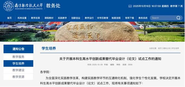 快科技10月17日消息金勺子,据媒体报道,近日南京航空航天大学印发《关于开展本科生高水平创新成果替代毕业设计(论文)试点工作的通知》,明确自2026届起,本科生可凭借高水平竞赛获奖、创新实践项目结题、学术论文发表、发明专利授权四类成果,申请替代传统的毕业设计(论文)。该政策一经发布,迅速引发广泛关注。